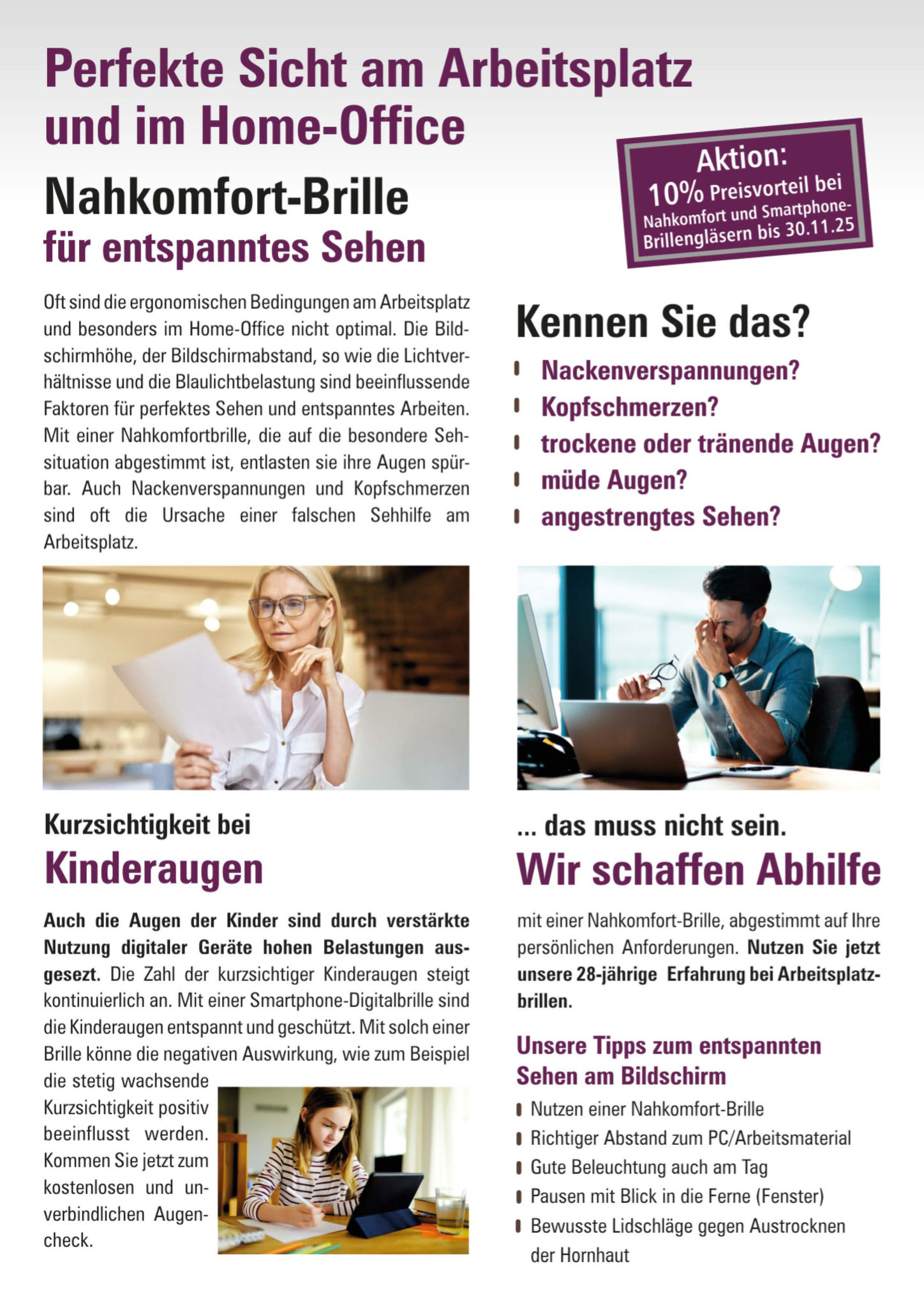 Viele Menschen verbringen durchschnittlich 8 bis 10 Stunden am Tag mit digitalen Bildschirmen. Dies kann zu einer digitalen Augenbeanspruchung führen, die auch als Computer-Vision-Syndrom bezeichnet wird. Symptome können können gereizte Augen, verschwommenes Sehen und Kopfschmerzen sein.